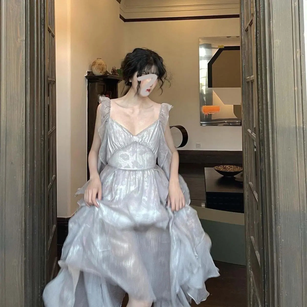 Softly-draped V-neck bodice, and a beautiful sheer textured overskirt will make you feel like royalty. Pair with strappy sandals or heels for that perfect night out.