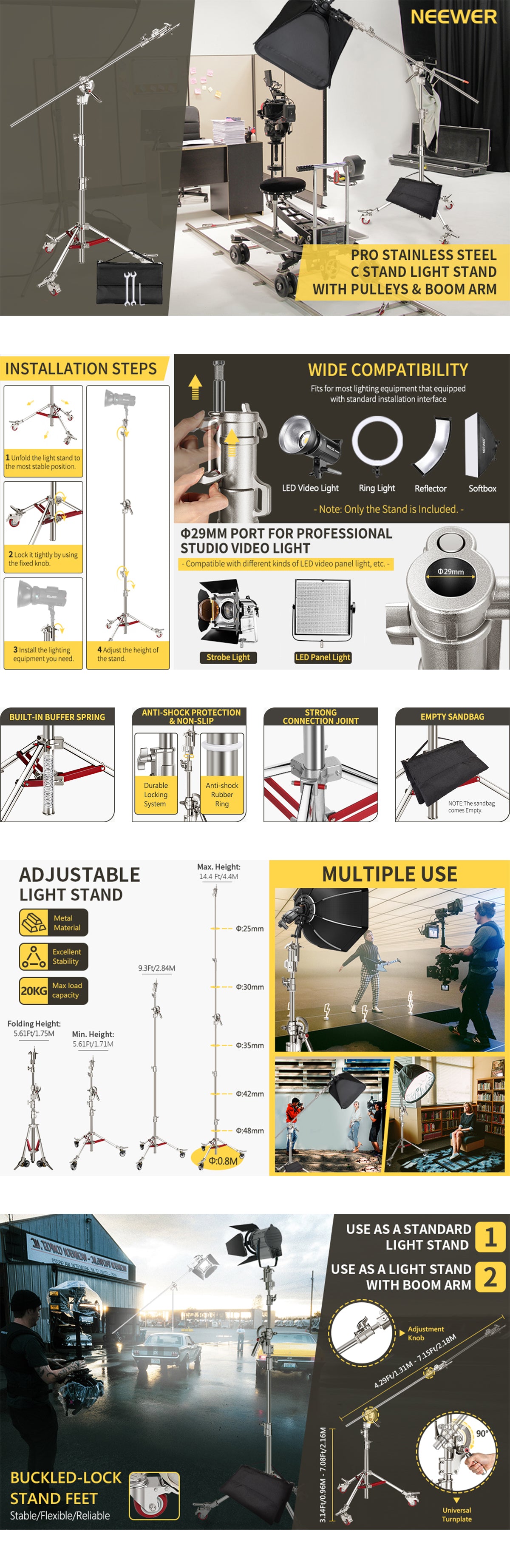- Stainless steel construction is corrosion-resistant and long-lasting, protecting the light stand from air pollution and salt exposure.