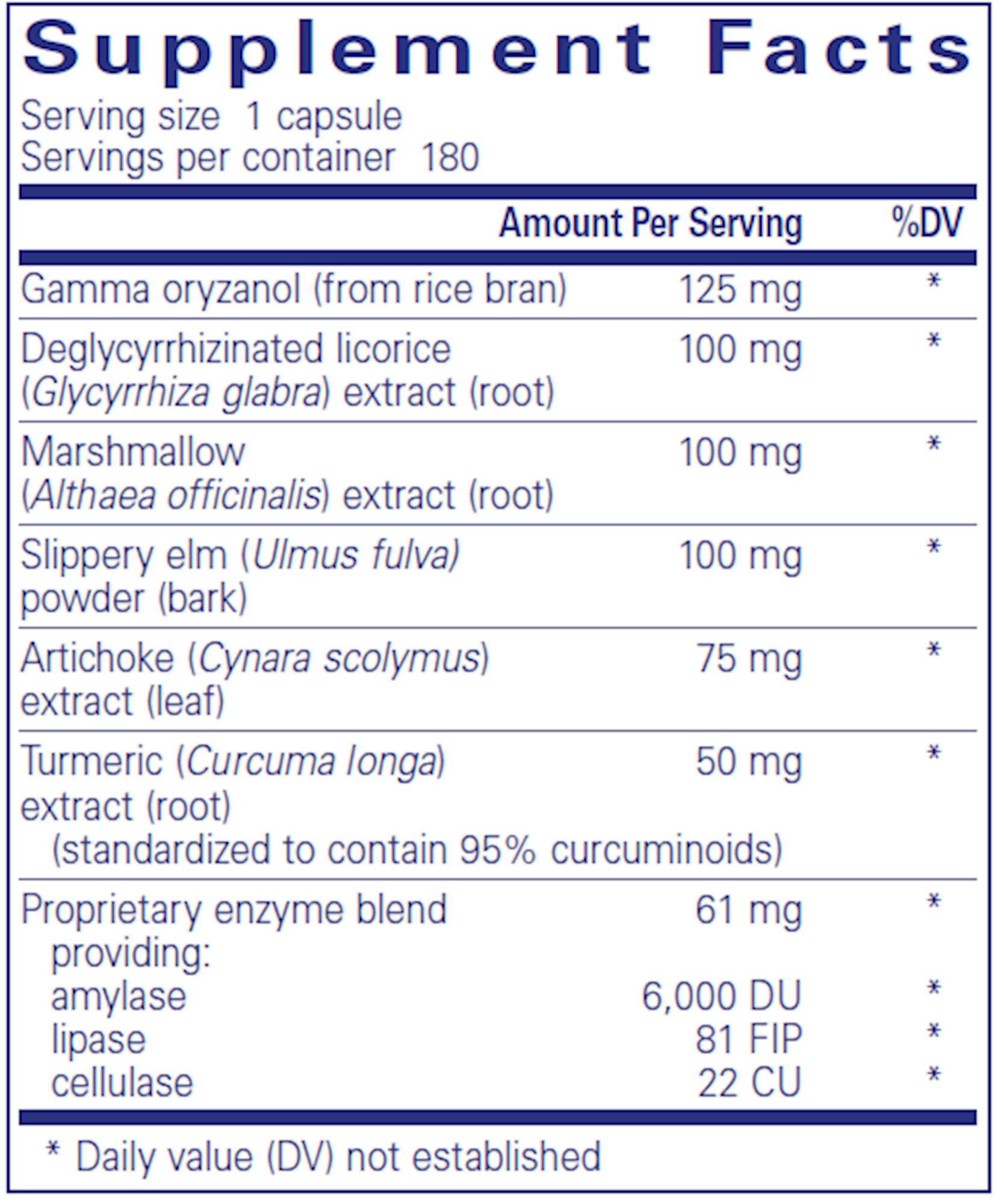 For decades, gamma oryzanol has been connected to healthy gastric secretion, even in difficult situations. Gamma oryzanol likely accomplishes this by affecting the autonomic nervous system. DGL, marshmallow, and slippery elm are herbal staples for soothing the GI tract and preserving the mucosal barrier. Artichoke can help to activate digestion, while plant-derived enzymes support the digestive process.*